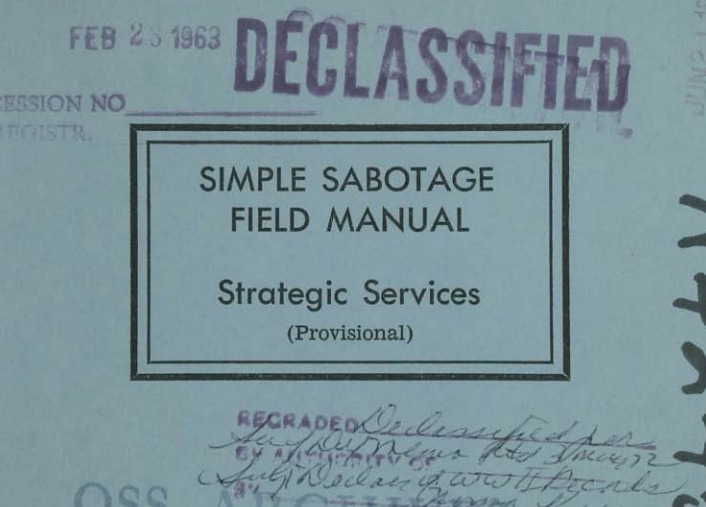 This morning, while seeking an entirely different and completely innocuous document, I came across the Simple Sabotage Field Manual developed by the precursor to the CIA (the Office of Strategic Services) in 1944 to provide instructions for sabotaging enemy organizations from the inside using inefficiency, bad management practices, and delays.