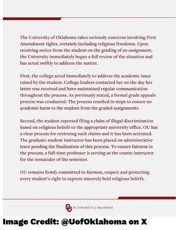 The default institutional response must be a robust defense of the faculty’s right and responsibility to grade students according to academic merit. The University of Oklahoma’s statement mentioned religious freedom but omitted academic freedom. This creates the impression that the university views the student’s religious freedom claim as more legitimate than the instructor’s professional judgment.