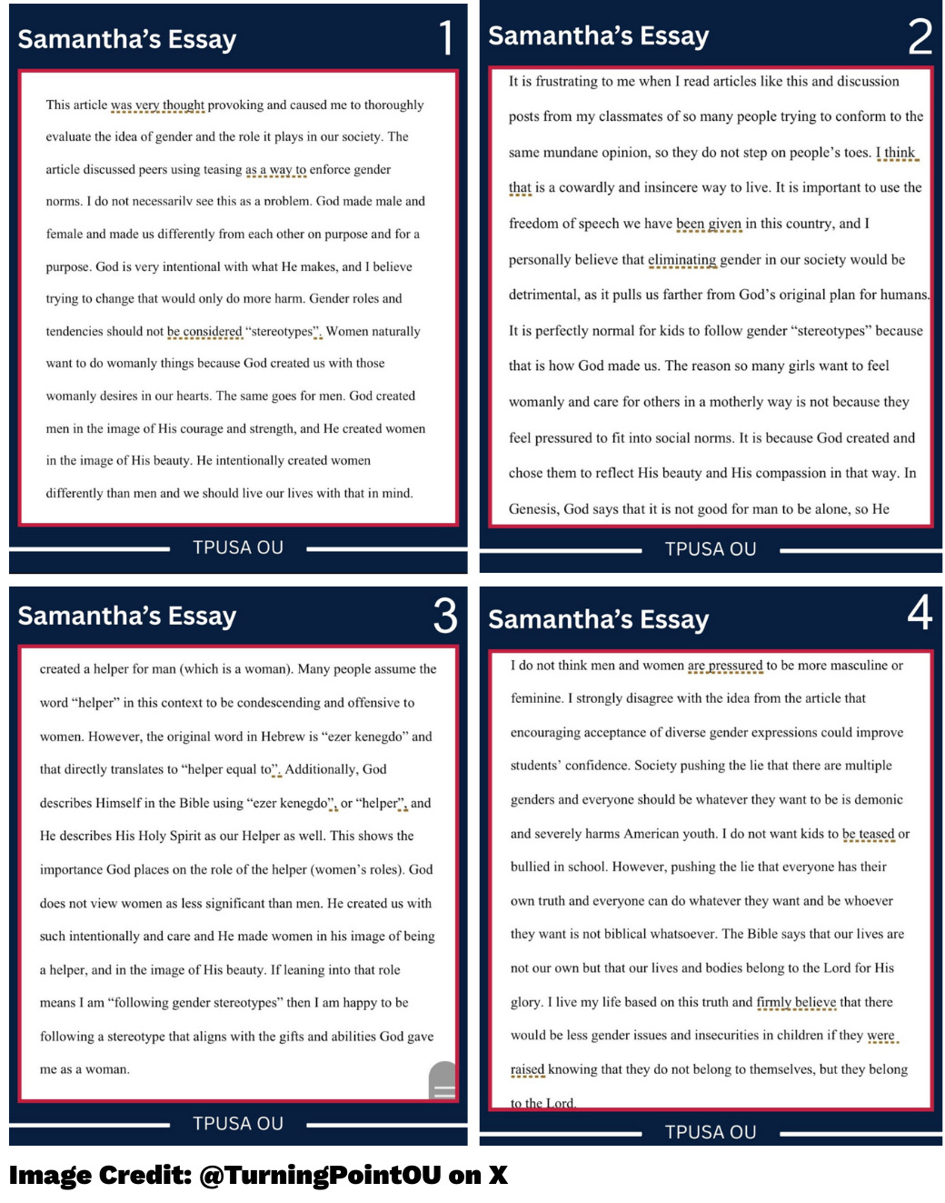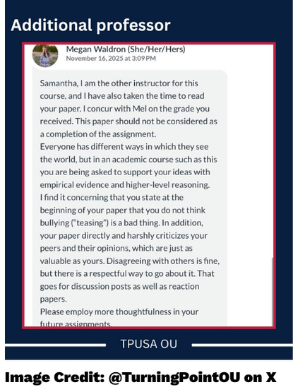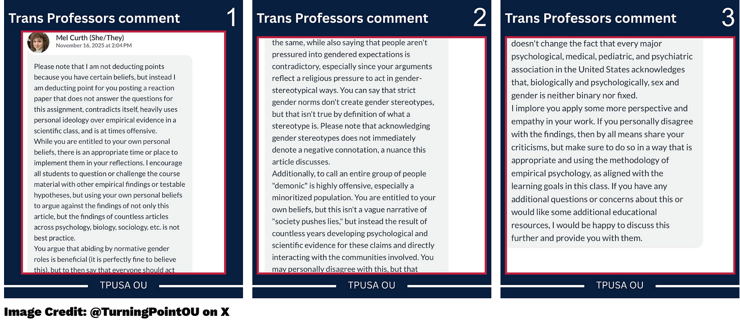 Three days ago, the University of Oklahoma chapter of Turning Point USA, a national right-wing student organization, posted on X (formerly Twitter) about an incident involving student Samantha Fulnecky and graduate instructor Mel Curth. Fulnecky submitted a psychology essay that, according to Curth, failed to meet the core requirements of the assignment, which was a 650-word reaction to an academic article on gender stereotypes. Fulnecky’s argument relied almost exclusively on personal religious beliefs, did not engage with the source material, and included inflammatory language, such as referring to the acceptance of multiple genders “demonic.”